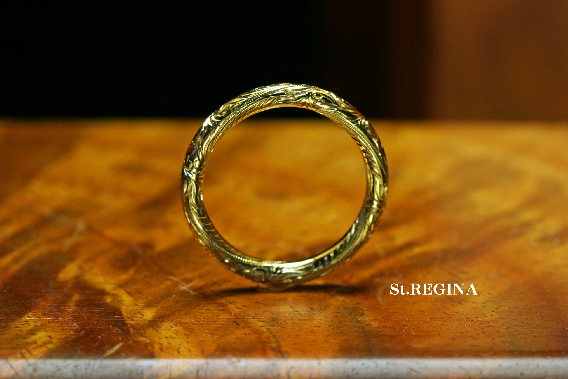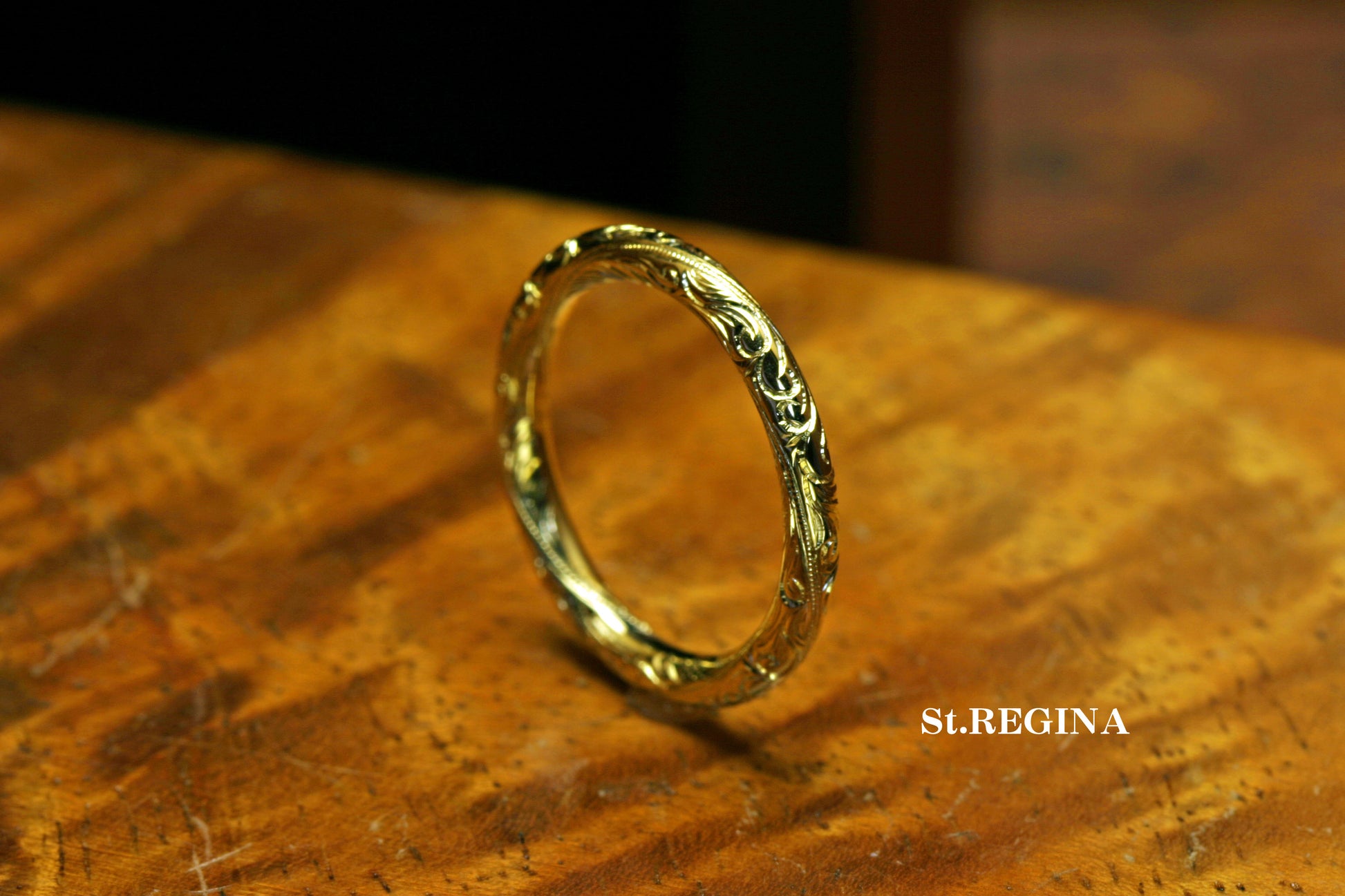 幅2.3ミリのチューブ型、全面に細かい彫りとミルグレインを施した繊細でかつ大胆なデザイン。