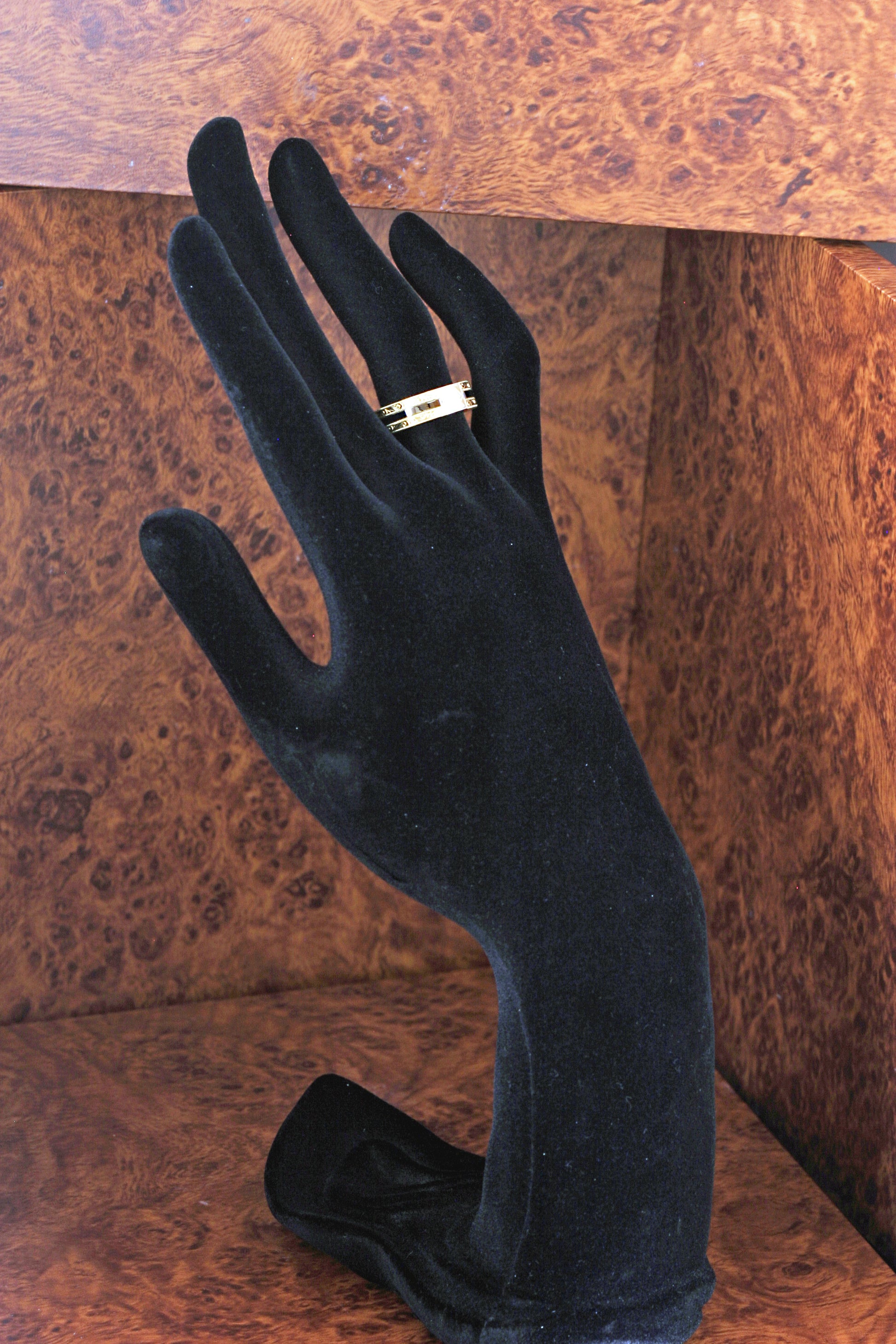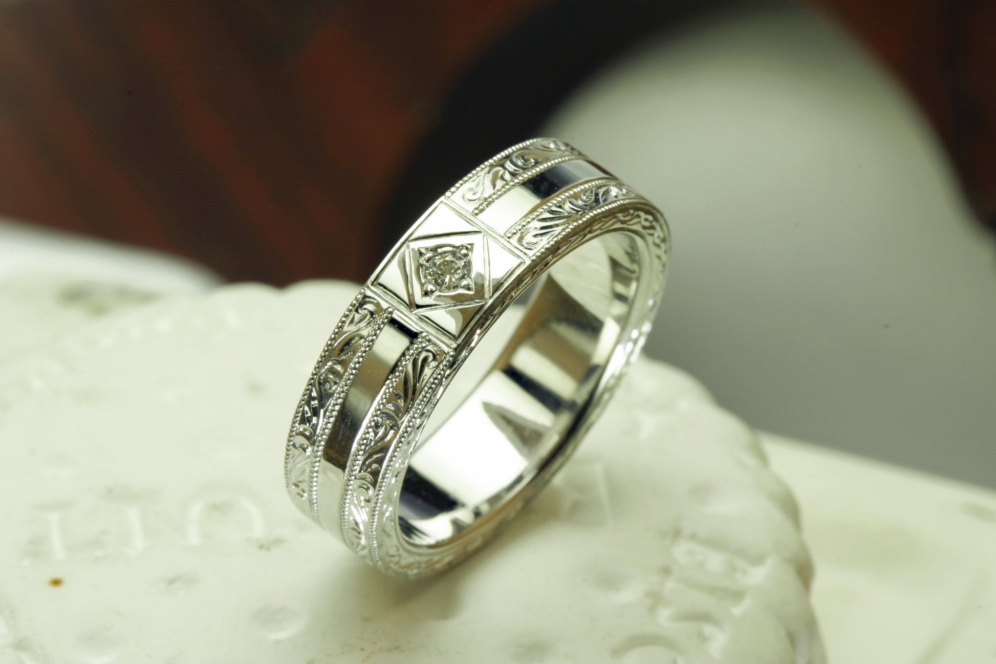 中央にプリンセス・ダイアモンドをセッティングし、上部と側面に柔らかい彫りを施しアームの中央にはブラックメッキでライン。