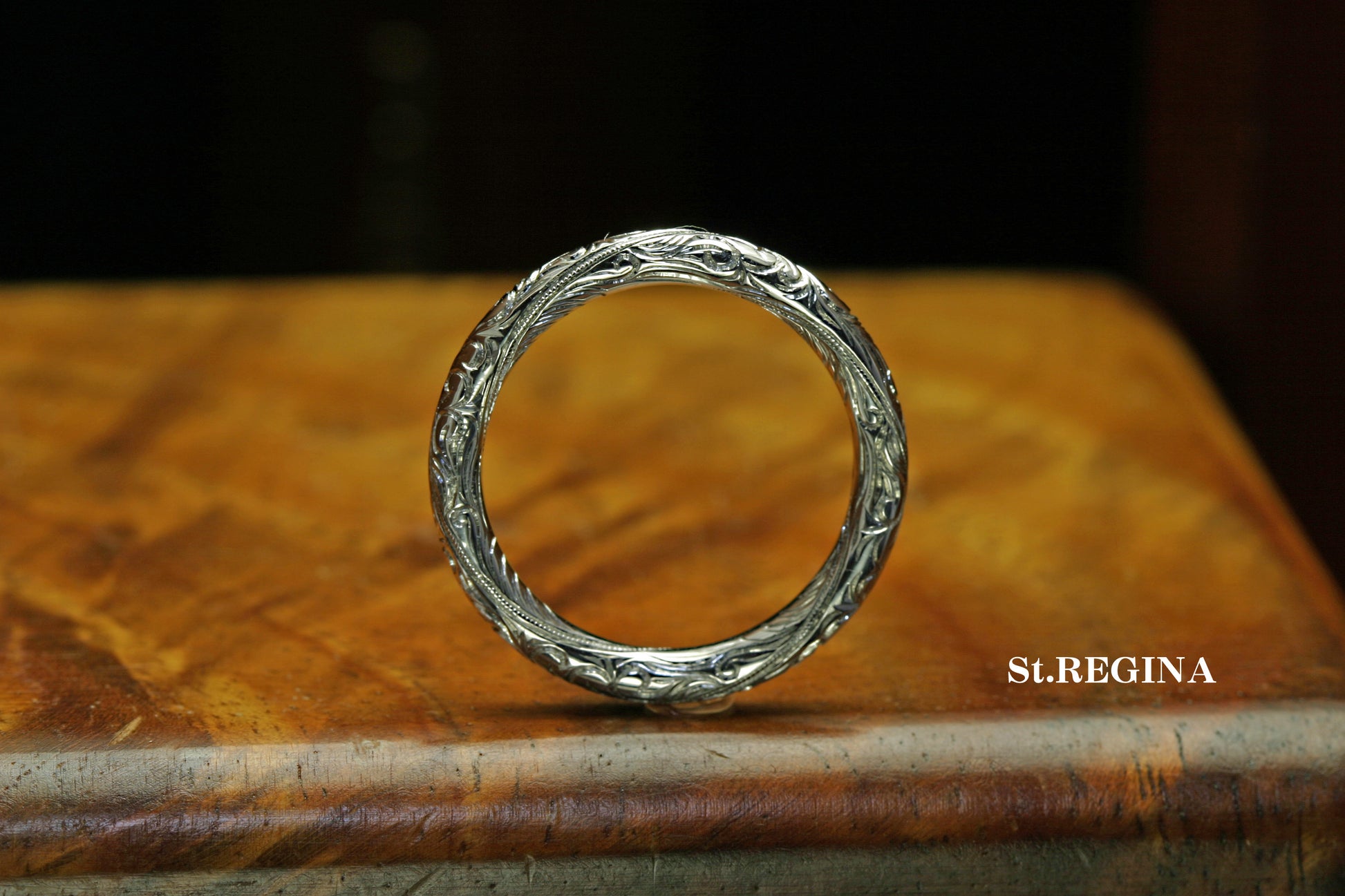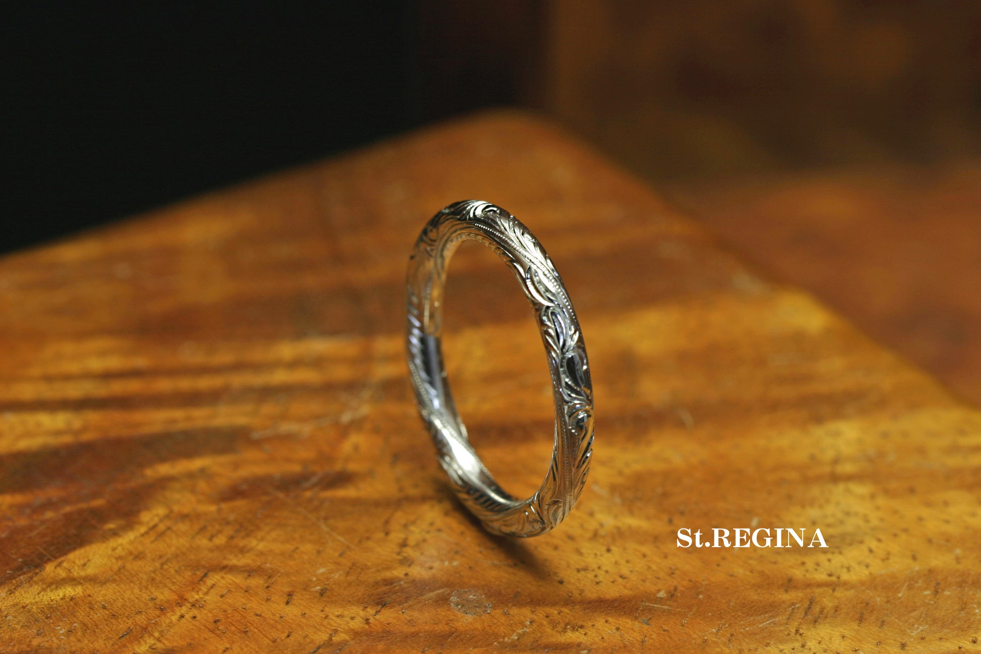 幅2.7ミリのチューブ型、全面に細かい彫りとミルグレインを施した繊細でかつ大胆なデザイン。