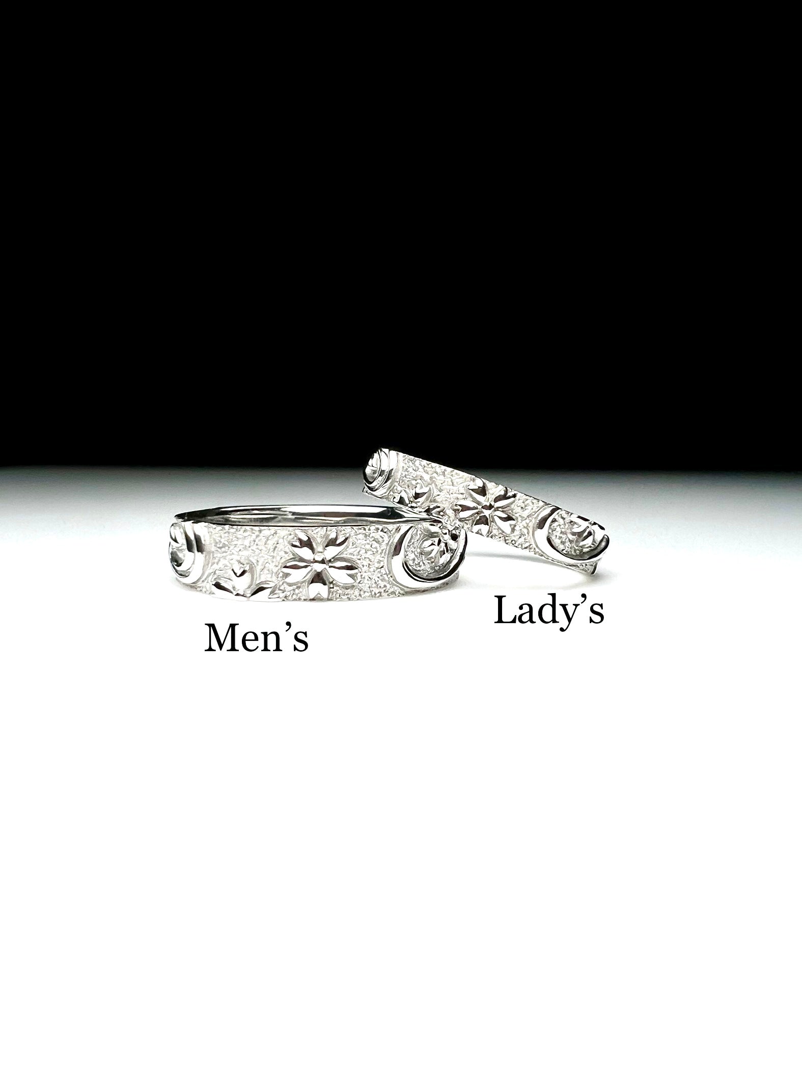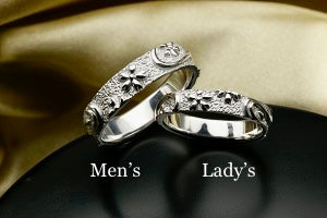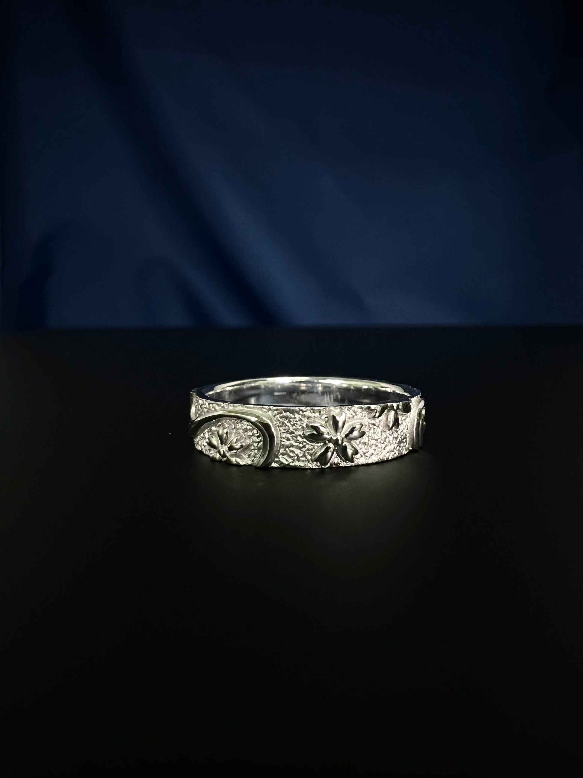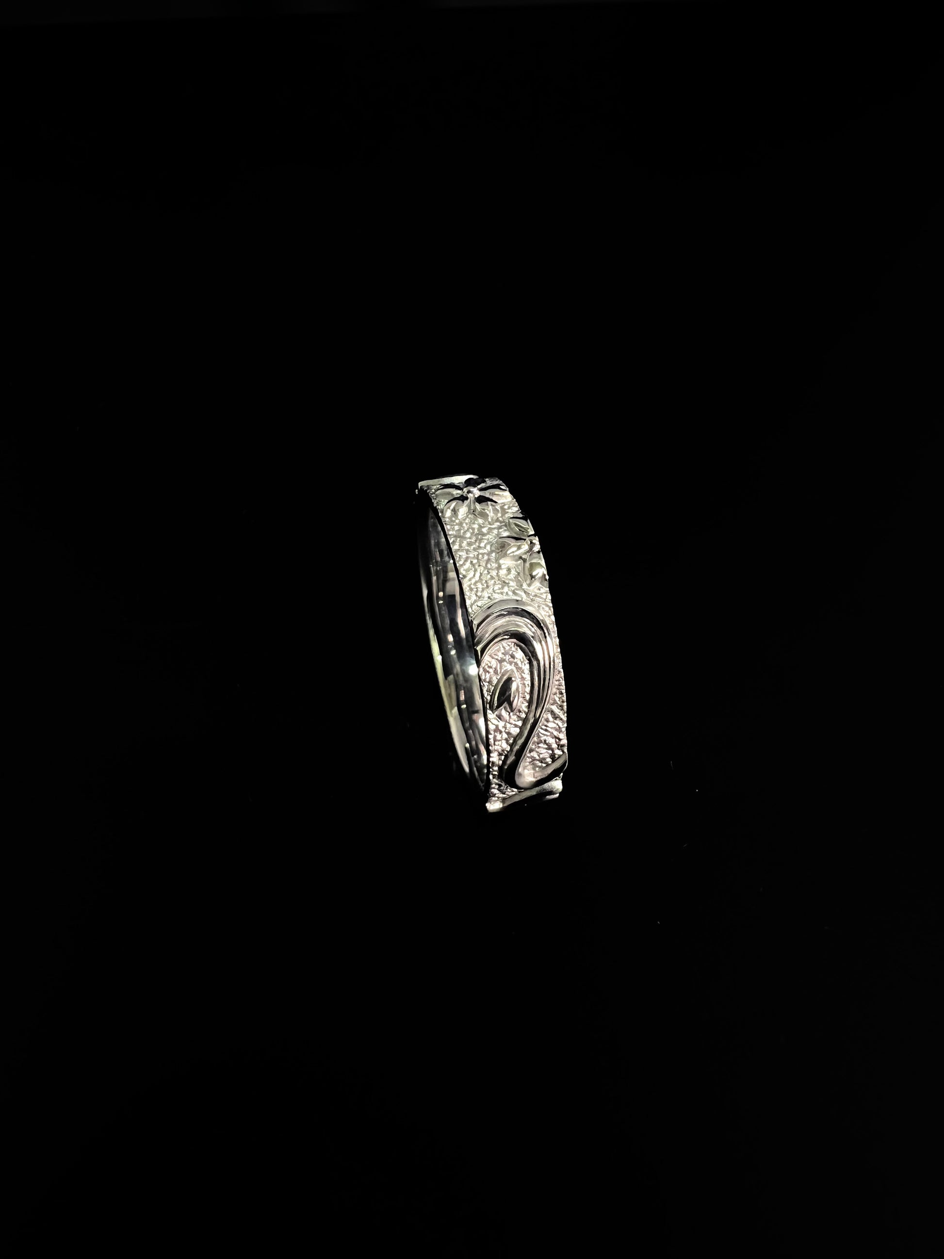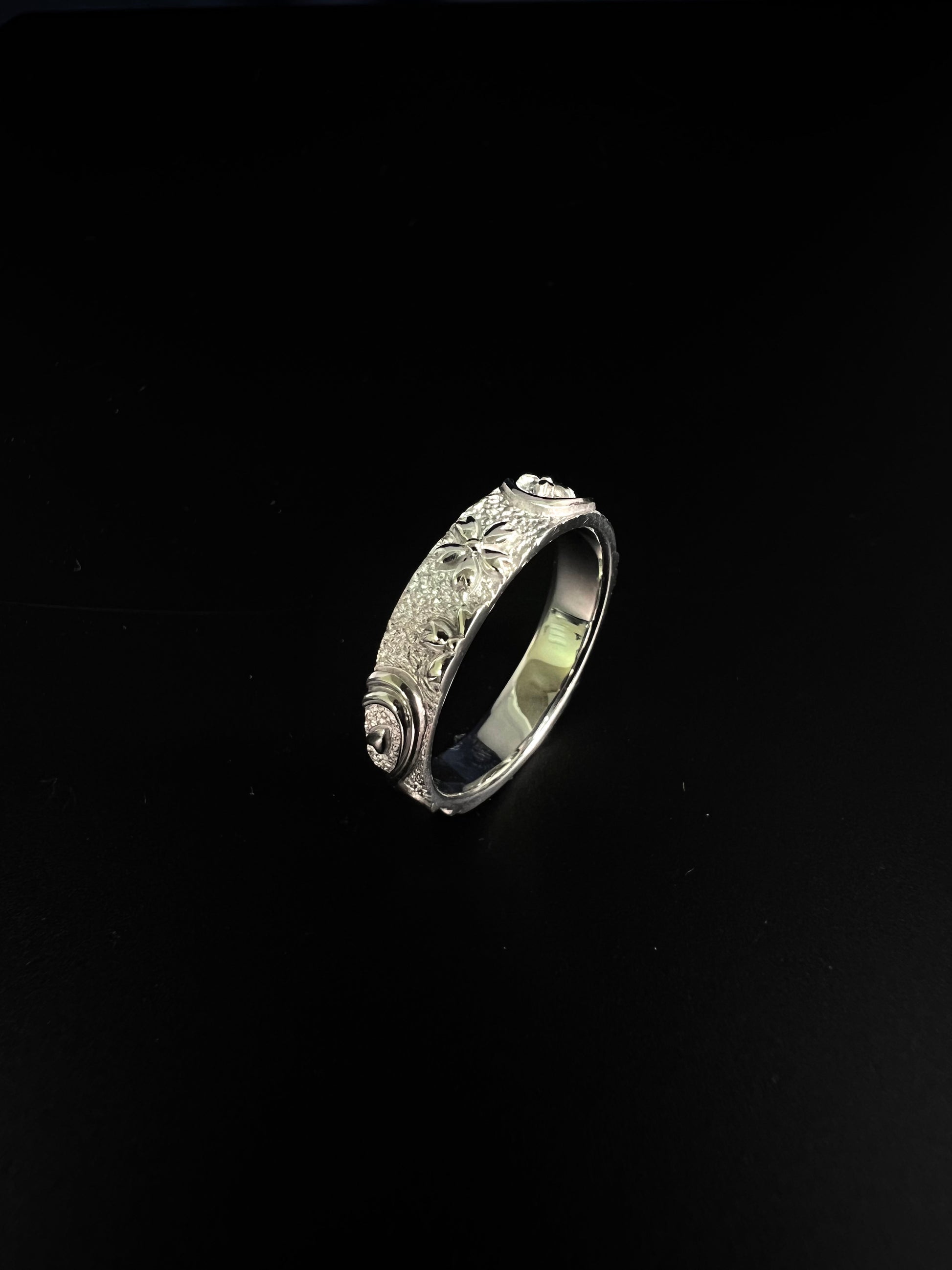 この文様を浮き彫りと深いテクスチャーで表現して、とても印象深いリングになっています。